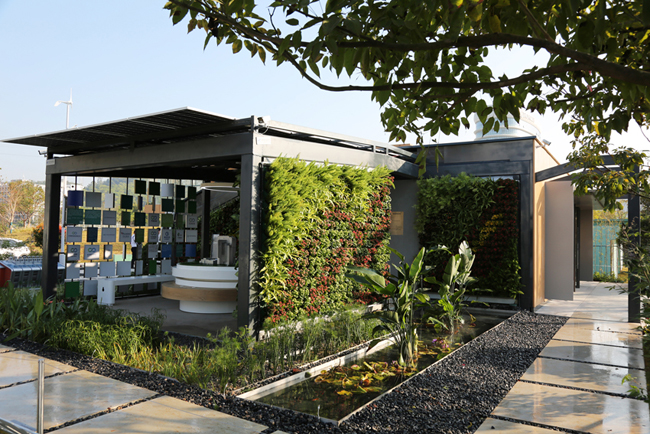 采用金沙澳门(中国)唯一官方网站专利技术土非土基质的垂直绿墙,为建筑在有限的空间里增加单位绿量,实现吸尘降尘、净化空气、隔热节能功能,为展区增添生态亮点。