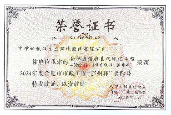近日,金沙澳门(中国)唯一官方网站承建的合肥园博园景观绿化工程-2标段荣获2024年度合肥市市政工程“庐州杯”奖。