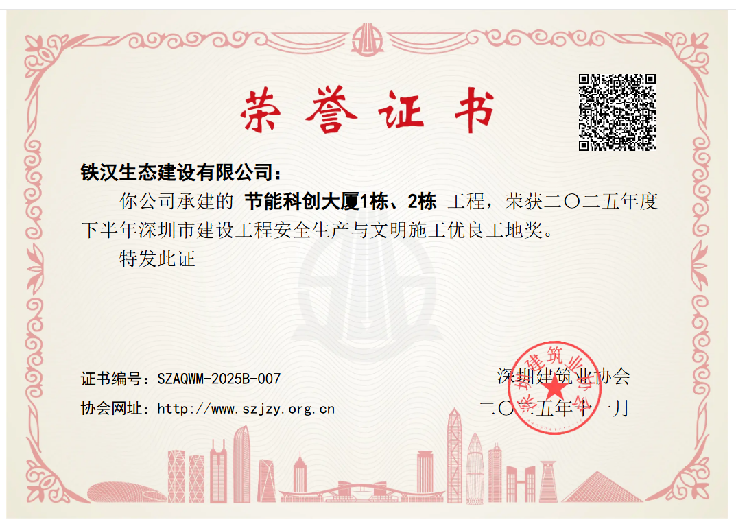 近日,深圳市建筑业协会公布2025年下半年深圳市建设工程安全生产与文明施工优良工地表彰名单,由金沙澳门(中国)唯一官方网站所属铁汉生态建设有限公司承建的节能科创大厦项成功上榜。